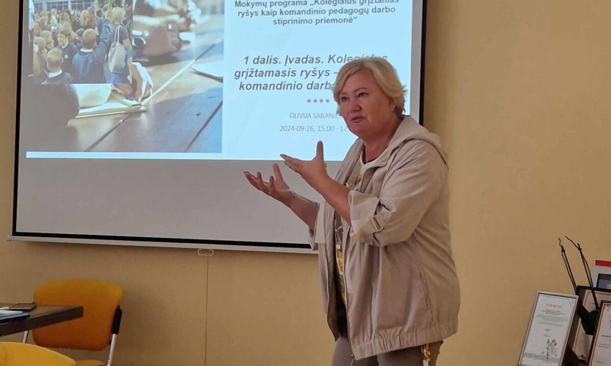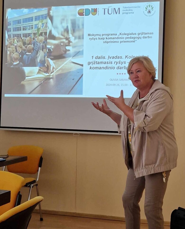 Progimnazijai kurti vidinę grįžtamojo ryšio kultūrą, įgalinti profesinę tarpusavio paramą padeda programos autorė, ilgametę vadybinę ir ekspertinio konsultavimo patirtį turinti lektorė Olivija Saranienė.
